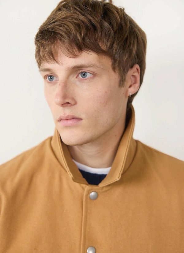 - Features: Men’s varsity bomber in tan, crafted from heavyweight cotton. Featuring silver snap fastenings, jetted welt pockets, and chunky rib detailing, this. bomber jacket from the Percival x Ilaria collection offers a relaxed yet stylish look with all-day comfort.