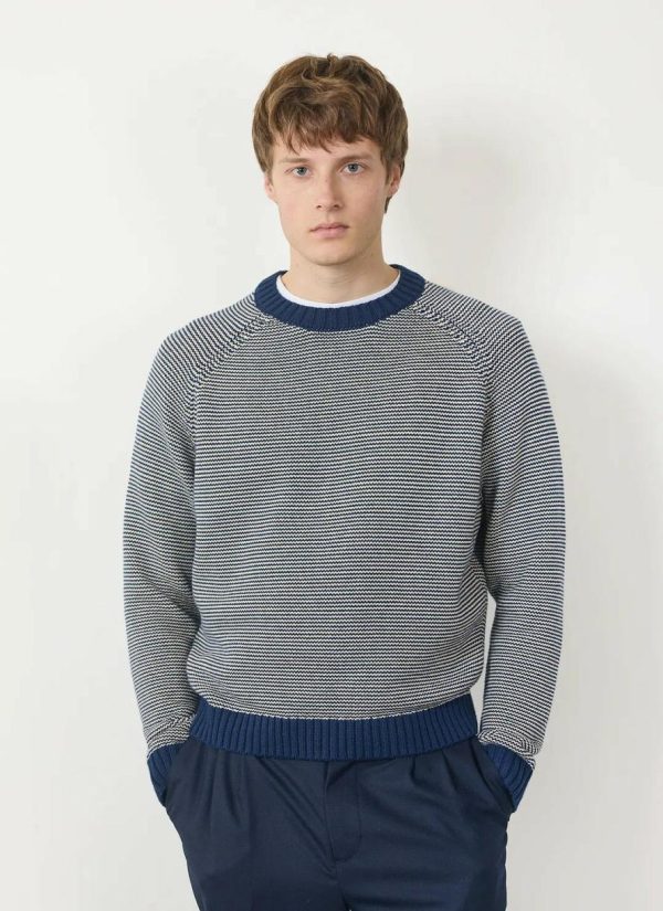 - Features: Men’s knitted navy and white sweater made from 100% organic cotton. Finished with a heavy rib crew neck for a slightly slimmer fit, this piece from the Percival x Ilaria collection is the perfect jumper for layering.
