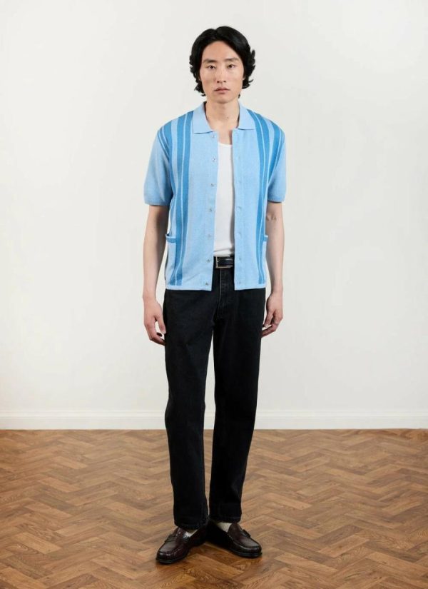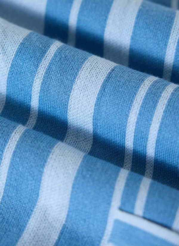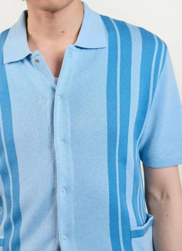 Striped knitted shirt, blue, Azure blue? Maybe. Azure is the color between cyan and blue on the spectrum of visible light. It is often described as the colour of the sky on a clear day. That is sweet, Google. Azure blue, knitted shirt, made for you. Quality 100% cotton, perfect fit.