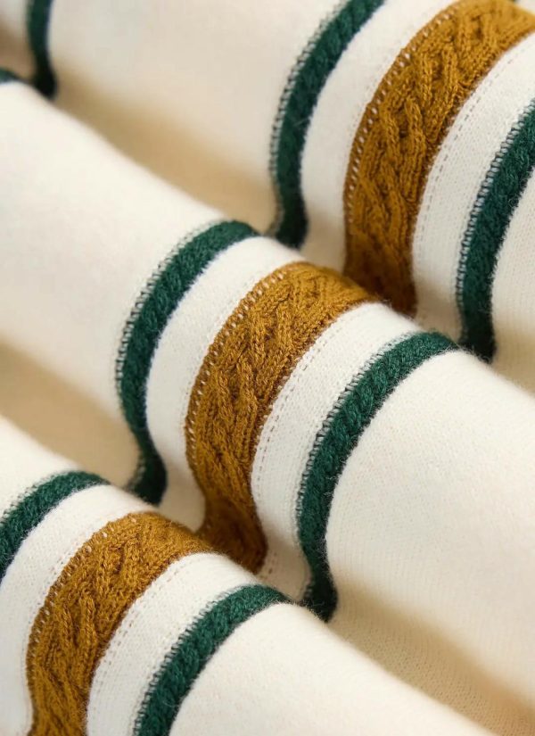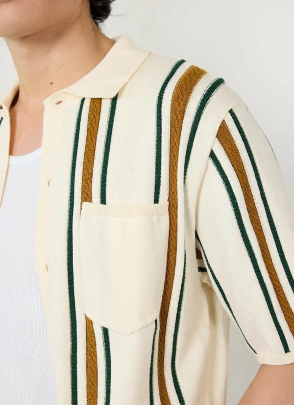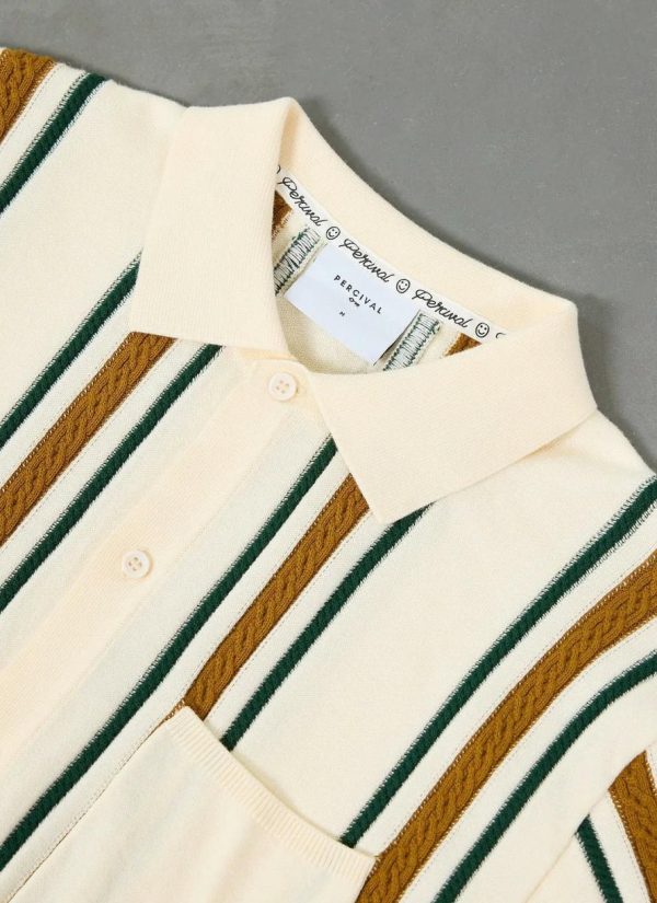 Ventura is an Italian, Spanish and Portuguese word that means “fortune” or so called, “luck”. It can also be used as a surname, ace. Ace knit polo shirt, one of the knits of the knit shirt season, light cable runs through in bronze with a cream base and forest stripe. Clean, tidy, easily wearable, and wishing you good fortune.