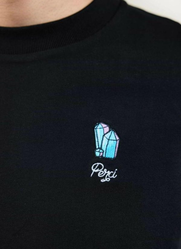 Charge your crystals. All sorts of quartz. It is not kryptonite, it’s the good stuff. Quartz is composed of the elements silicon and oxygen, and in its pure state is colorless. Percival Quartz embroidery tee, may the quartz be with you.