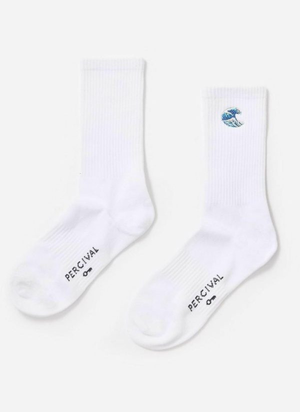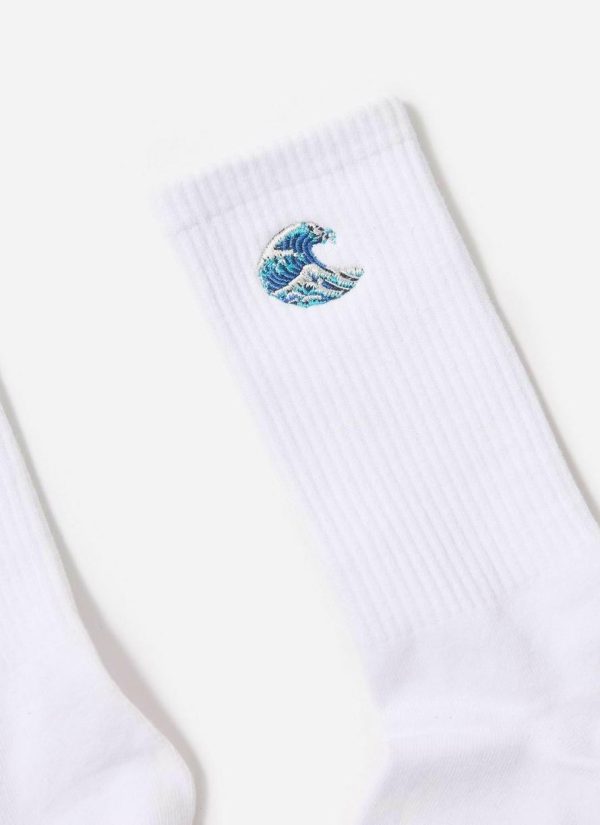 The wave, a disturbance or variation that transfers energy progressively from point to point. In this case a wave of water. Part of our new embroidered sock collection.