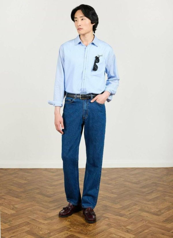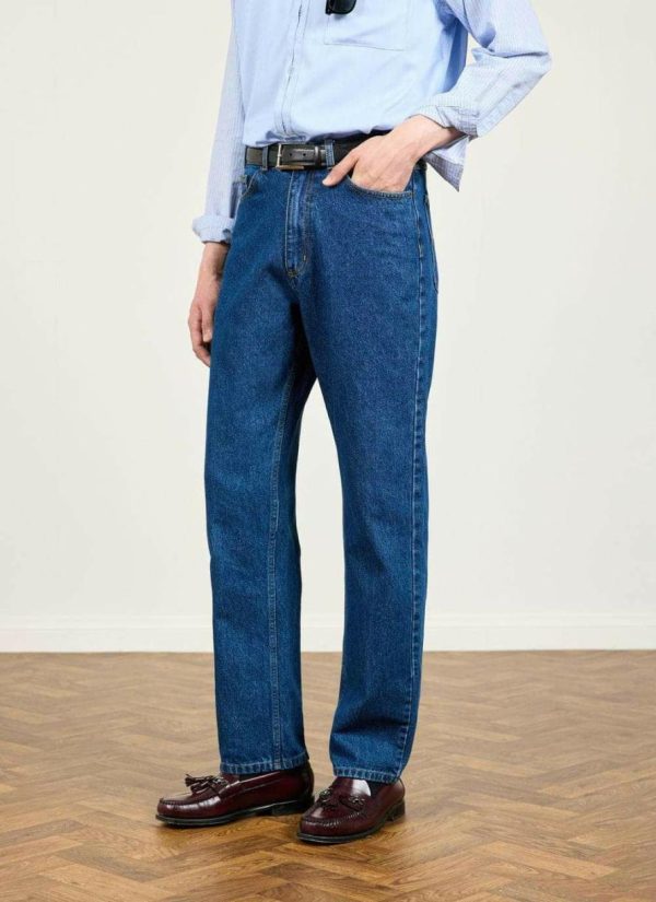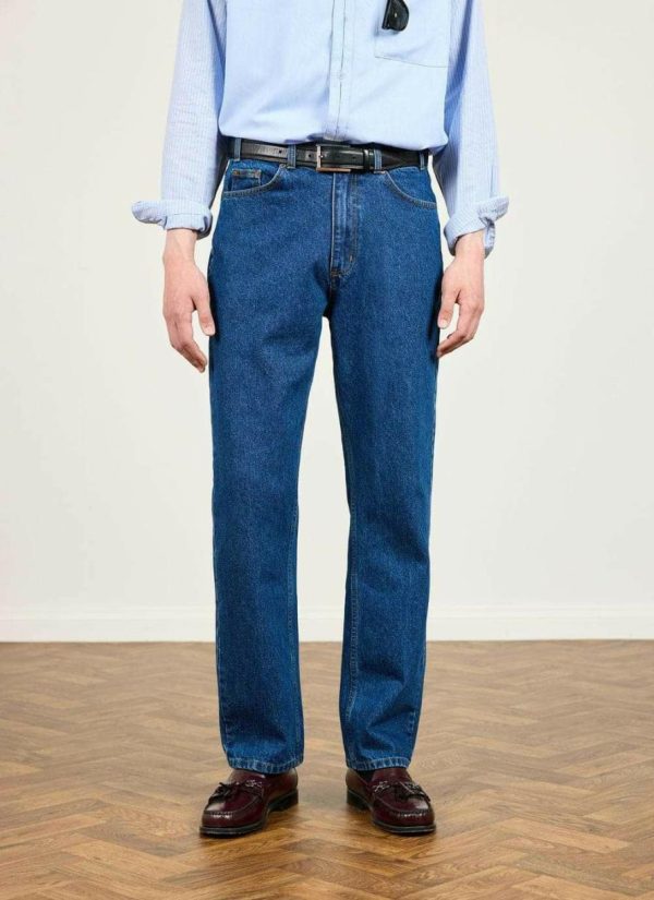 - Features: Men’s jeans in a mid wash blue. Made from a heavyweight 14oz denim and finished with a branded leather tan back waistband patch, these straight leg jeans are ideal for casual fits.