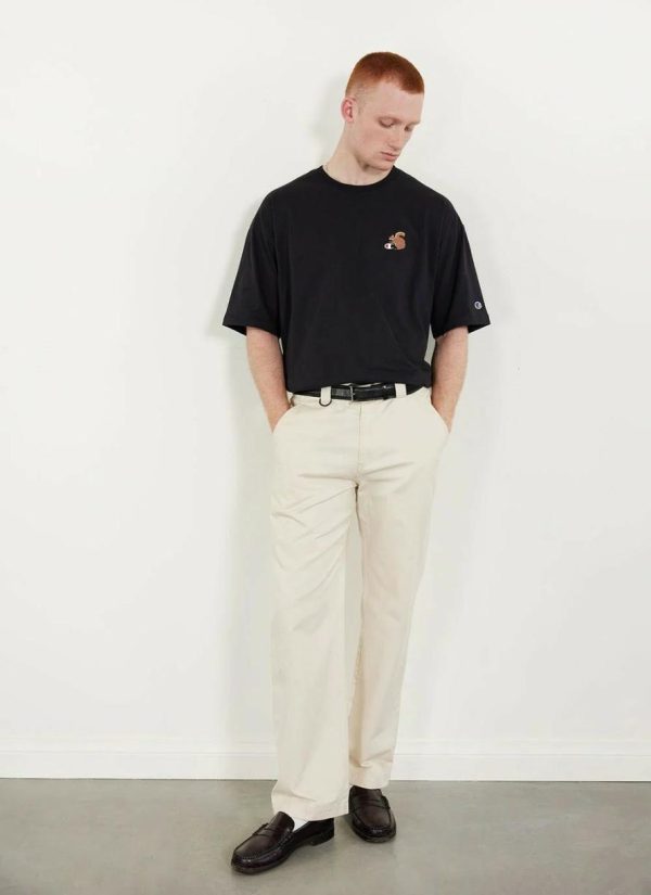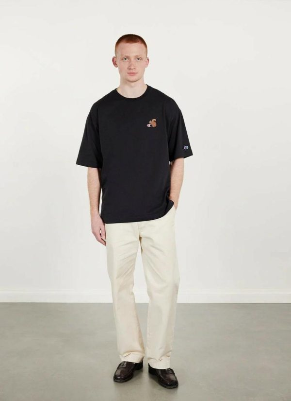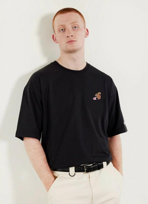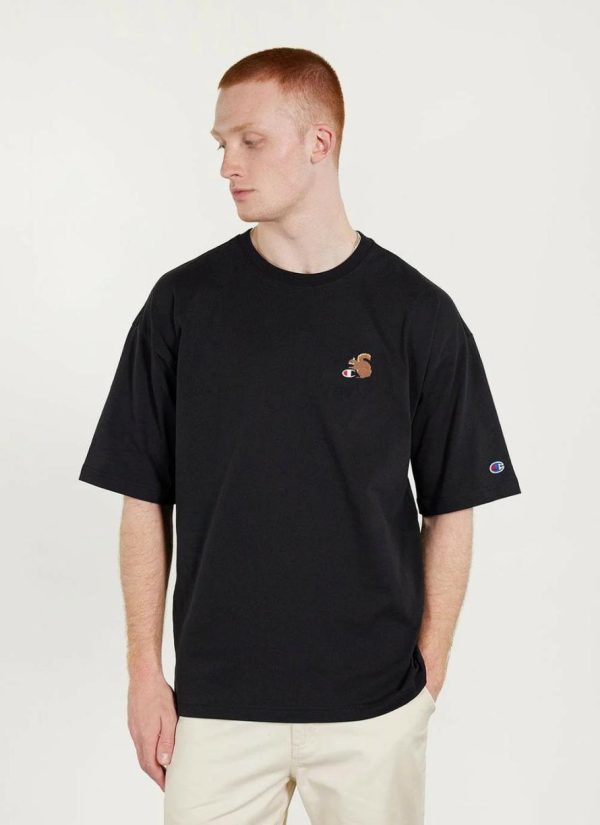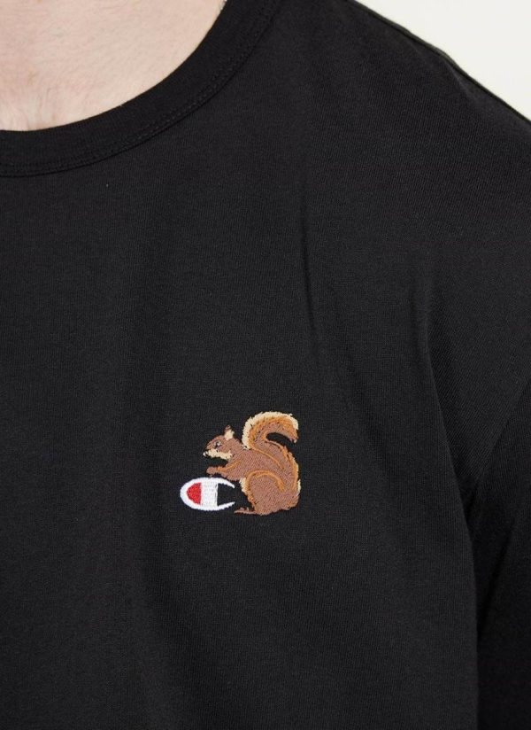 - Features: Men’s short sleeve t shirt with squirrel and Champion embroidery. Embroidered by Percival in London on a 180 gsm premium cotton, this black champion t shirt is ideal for warm weather and an easy-to-wear staple.