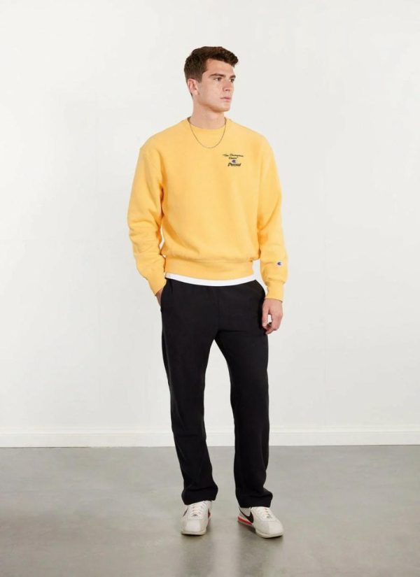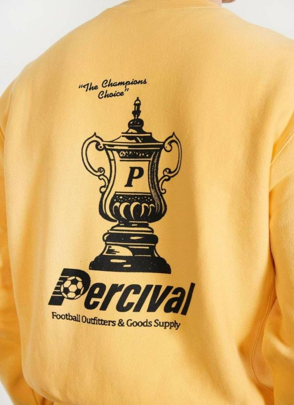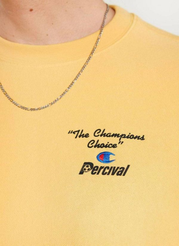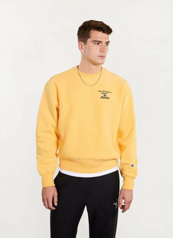 - Features: Men’s fleece sweatshirt with screenprint and champion embroidery. Screen printed by Percival in London on 400gsm reverse weave premium fleece, this mustard champion sweatshirt is ideal for cooler weather and is an easy-to-wear staple.